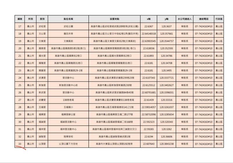 左營等7區多里停水55小時,包括小港區桂林、中厝、廈莊、合作、孔宅、高松、山東、松山、松金、濟南、青島、泰山、正苓、順苓、宏亮、六苓、山明(工業用除外)、店鎮(沿海路以東、工業用除外)、二苓(沿海路以東)、大苓(沿海路以東)、坪頂、大坪里;路竹區甲南、甲北、竹園、下坑里;岡山區和平、華崗、嘉興、竹圍、大遼、台上、碧紅、大莊、嘉峰、潭底、程香、後紅里;燕巢區鳳雄、角宿、瓊林、橫山、安招里;大樹區九曲、三合里(義大世界、義大中小學一帶);左營區光輝、莒光、永清、合群、明建、祥和、屏山、進學、尾北、尾南、尾西、廟北、廟東、頂北、頂西、聖后、中南、中北、聖西、聖南、廍北、廍南、路東、城南、埤西、埤北、埤東、崇實、自助、果貿、果惠、果峰、海勝里;鼓山區雄峰、鼓峰、自強、前峰、民族、內惟、光榮、建國、忠正、龍井、平和、民強、正德、厚生里。