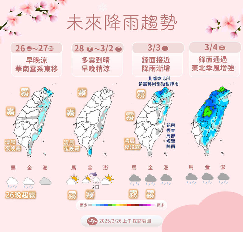 另,張承傳提醒,今晚至下週一期間,中部以北、金馬地區整日不定時有低雲或霧影響能見度,南部地區早晚也可能有霧出現,基隆北海岸週日至下週一期間,也有機會出現霧,民眾行車用路、交通往返須注意。