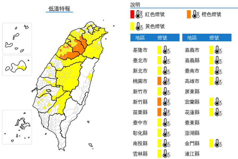 因輻射冷卻效應明顯,各地早晚氣溫偏低,氣象署今晨對18縣市發布低溫特報,多數縣市有10度以下氣溫發生的機率,其中桃園市、新竹縣、苗栗縣有6度以下氣溫發生的機率。(圖擷取自中央氣象署)