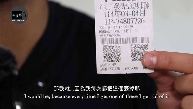 受訪男子則十分懊悔自己沒有提早知道這個冷知識,因為他每次都會把發票直接丟掉,可能就此錯過中獎機會。 (圖擷取自「Stopkiddinstudio」YouTube)