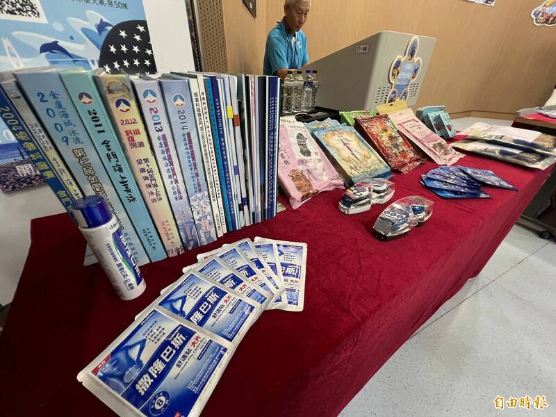金門縣政府展示歷年海上長泳成果,並公布今年廠商提供的贊助商品。(記者吳正庭攝)