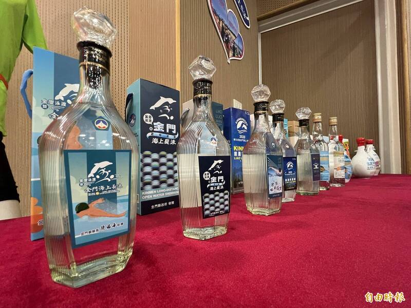 金門縣政府歷年舉辦「金廈泳渡接力公開賽」與「金門海上長泳」的各式紀念酒。(記者吳正庭攝)