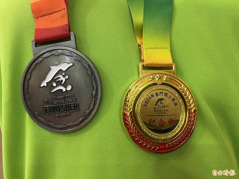 金門縣政府去年、前年舉辦「金門海上長泳」獎牌。(記者吳正庭攝)