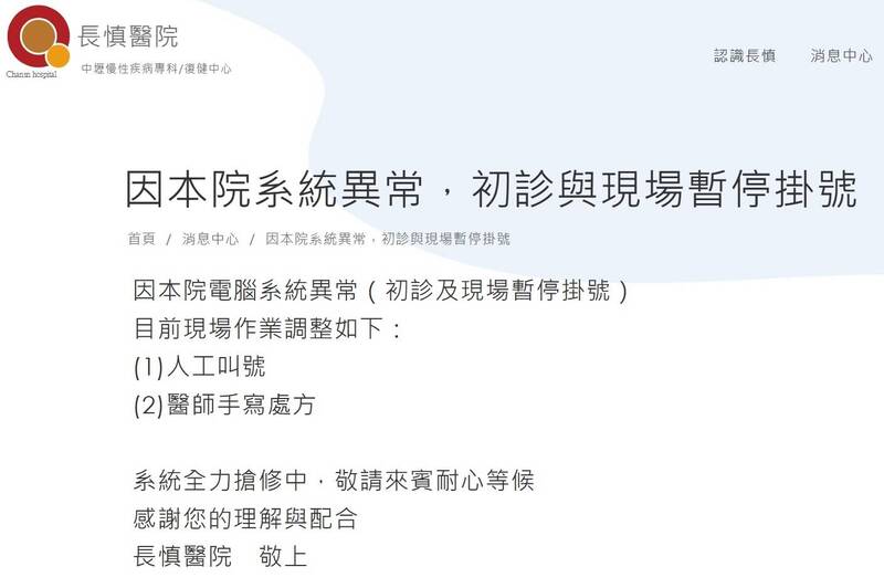 長慎醫院於4月16日公告:「因本院系統異常(初診及現場暫停掛號),現場作業調整如下:(1)人工叫號、(2)醫師手寫處方,系統全力搶修中,敬請來賓耐心等候,感謝您的理解與配合。長慎醫院敬上。」