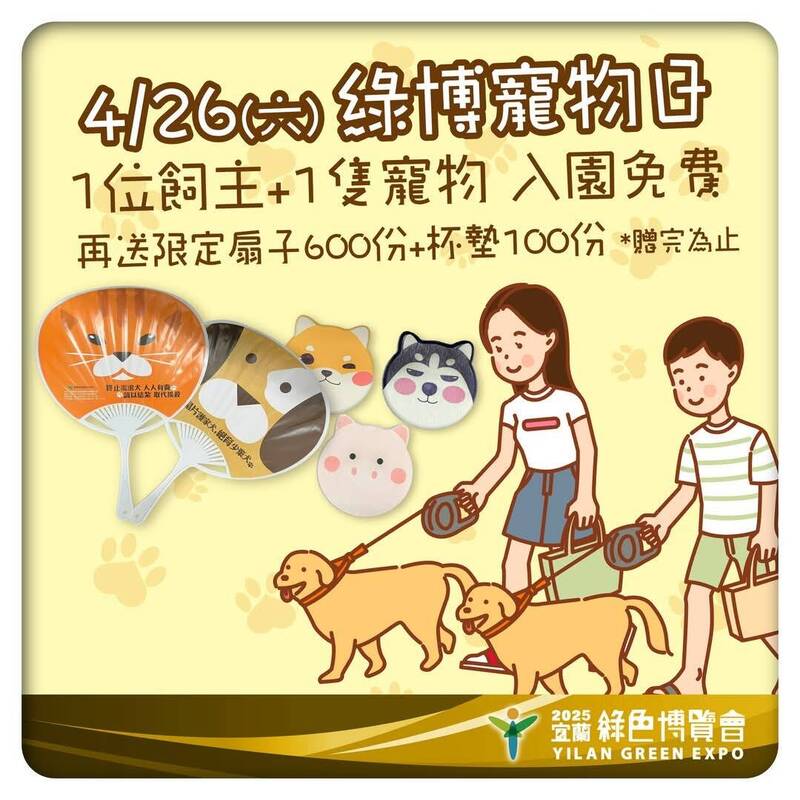 宜蘭綠色博覽會訂定本月26日為寵物日,飼主當天攜帶寵物可免費入園,並獲贈限量小禮物,寵物不限毛小孩,不過,若有安全疑慮,將禁止進入園區。