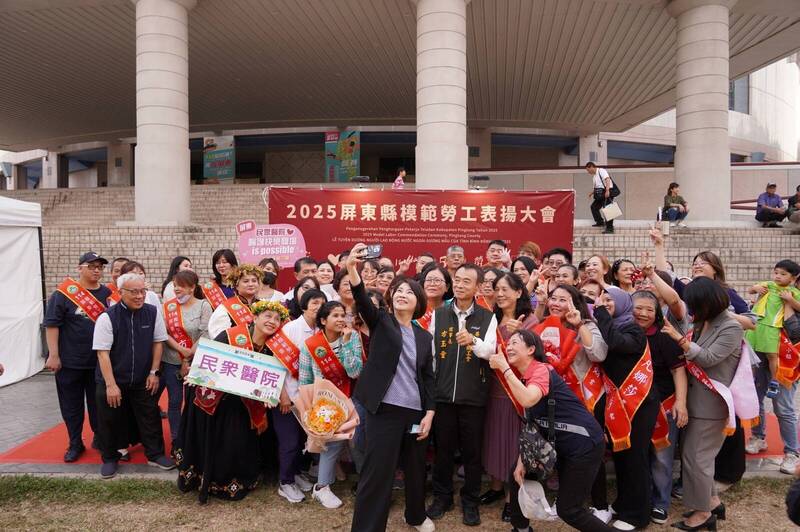 屏東縣長周春米與模範勞工自拍。(屏東縣政府提供)