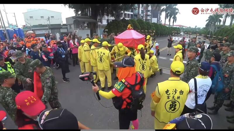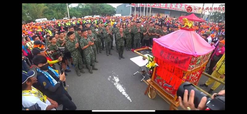 白沙屯媽祖鑾駕今天早上停駕斗六陸軍砲測中心營區門口,為國軍賜福。(圖擷取自白沙屯媽祖網路電視台)