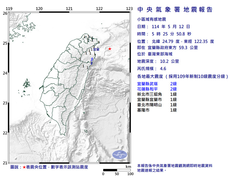 根據中央氣象署資料顯示,今天清晨05時25分在台灣東部海域發生芮氏規模4.6地震,地震深度為10.2公里,震央位於宜蘭縣政府東方59.3公里。各地測得最大震度為宜蘭縣及花蓮縣2級,新北市、台北市及基隆市則測得1級震度。