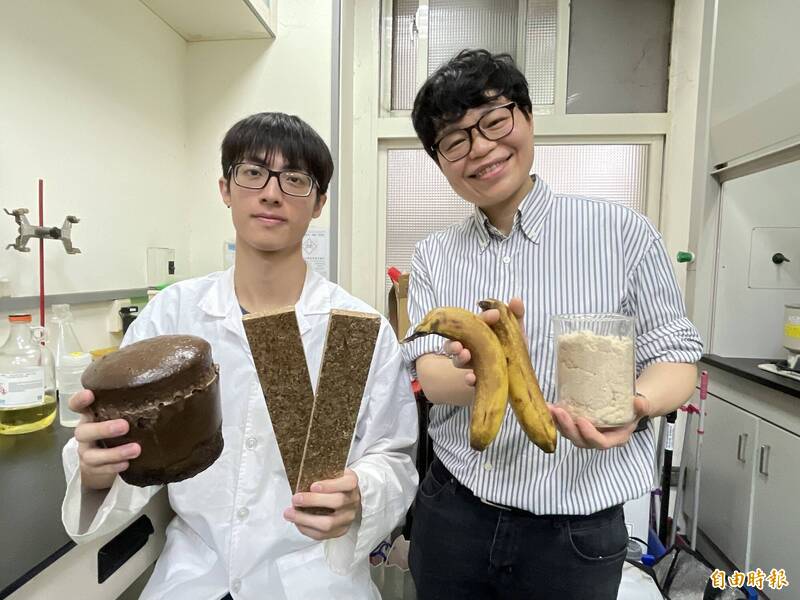 興大學生董浩悅(左)與蔡惠心,在陳奕君(右)指導下,將軟爛香蕉廢材變建材。(記者蘇孟娟攝)