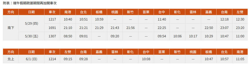 高鐵公司表示,針對台中以北自由座需求較高時段,疏運期間特別擴大自由座運能,包括:南下的5月29日(週四)18時到20時(每整點25分南港站發車);與北上的6月1日(週日)10時到21時(每整點04分台中站發車,21時另有51分發車班次)。