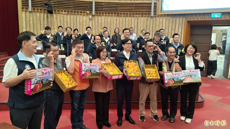 這款水蜜桃來自神仙住的地方!為支持在地原鄉農業,高雄市議長康裕成、市長陳其邁,今偕同陳幸富、高忠德、陳善慧、張漢忠、劉德林、黃秋媖等多位議員及市府首長,共同在市議會推銷盛產中的那瑪夏水蜜桃,並在議會員工餐廳公開販售。
