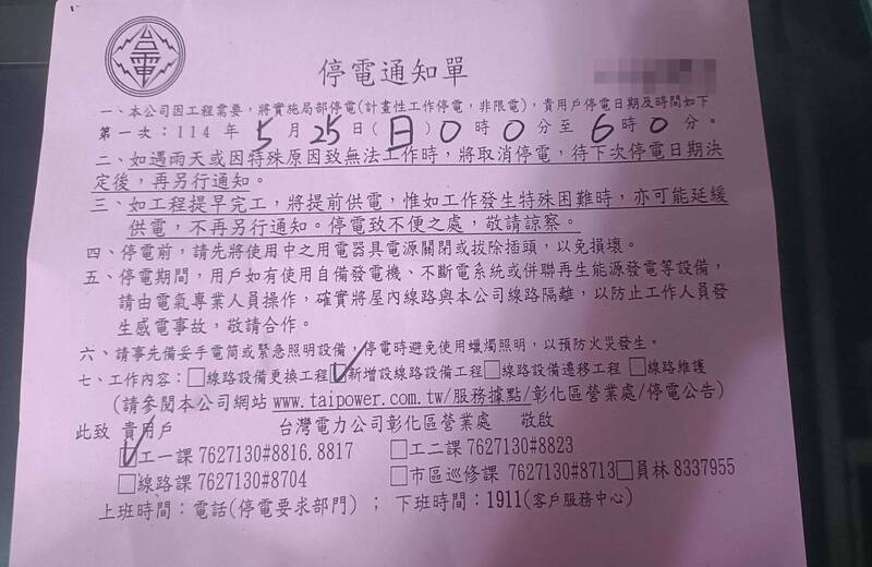 台電彰化區營業處25日凌晨零點起,將在花壇鄉進行供電設備拆除併辦線路強化改善工程,施工時間到清晨6點,時間長達6小時,停電戶數914戶;由於近來高溫炎熱,公告貼出立即引起鄉民不滿,有鄉民砲轟大家晚上不要睡覺了會熱死。台電彰化區營業處表示,會全力提前完工,提早復電。