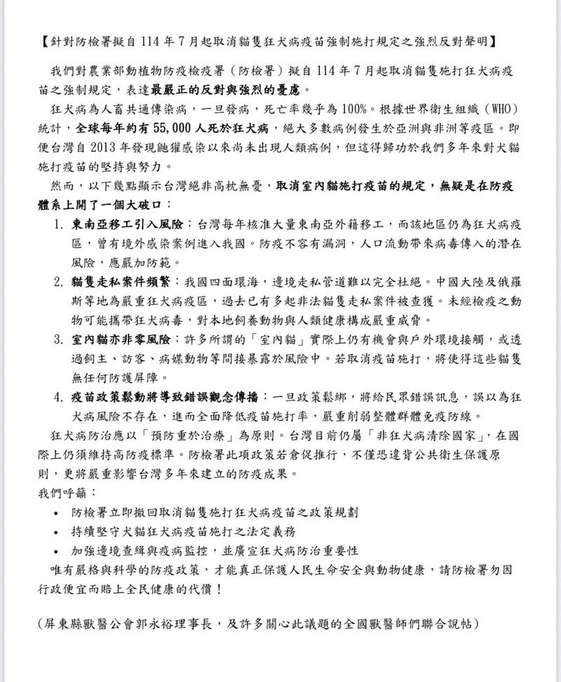 屏東縣獸醫公會說帖,反對7月起取消貓隻狂犬病疫苗強制施打規定。(屏東縣議員梁育慈提供)