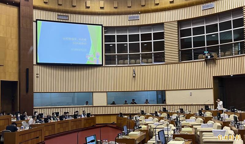 針對中央7月起取消貓隻狂犬病疫苗強制施打規定,屏東縣議員梁育慈(左)質詢屏東縣府農業處長鄭永裕(右)。(取自屏東縣議會網站)