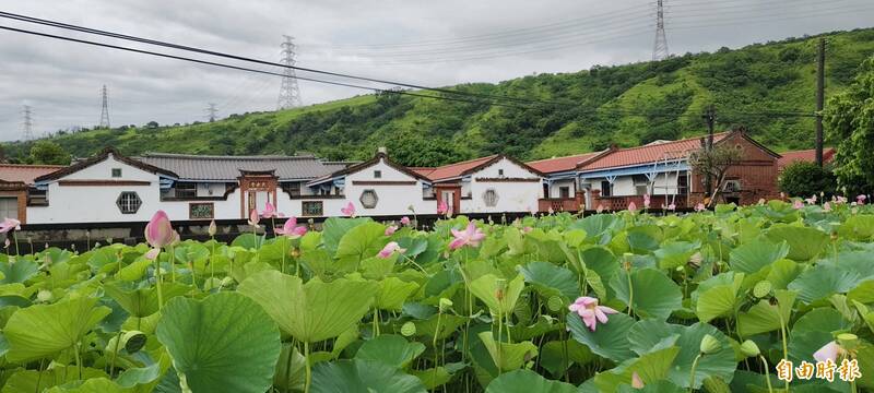 趙家古厝荷花綻放,與古厝青山相映。(記者張軒哲攝)
