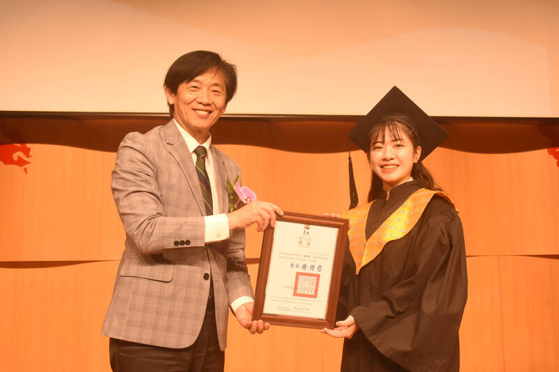 台南市副市長葉澤山(左)頒發市長獎給畢業生。(南藝大提供)