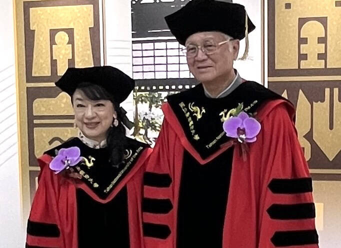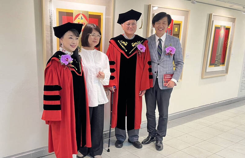 「台灣現代版畫之父」廖修平(右)及旅日明星、藝術家翁倩玉(左)獲頒台南藝術大學名譽藝術博士。(南藝大提供)