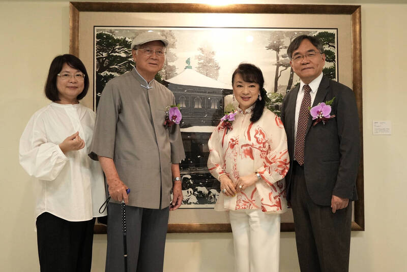 台南藝術大學名譽藝術博士廖修平(左二)、翁倩玉(右二)在南藝大舉辦版畫特展,並將展出的10件作品捐贈給南藝大,由校長邱上嘉(右一)代表受贈。(南藝大提供)