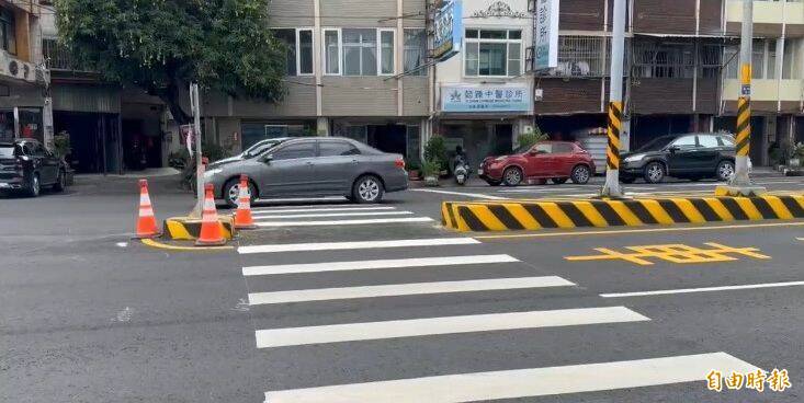 工務段暫時在中央標誌桿和庇護島,圍上警示錐筒提醒用路人。(記者張聰秋攝)