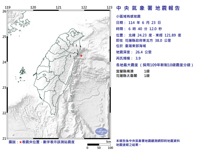 台灣東部海域06:40規模3.9地震 最大震度1級