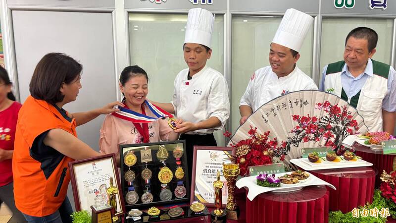 陳宏文(中)接連在新加坡、韓國首爾國際廚藝競賽勇奪5面金牌,為國爭光,今天(4日)在感恩餐會將金牌獻給媽媽。(記者楊金城攝)
