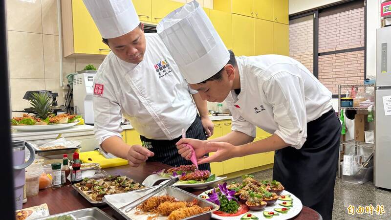 北台南家扶生陳宏文(右)在恩師黃裕文(左)指導下,烹製3道別具意義的料理,向一路支持他的人致上最誠摯謝意。(記者楊金城攝)