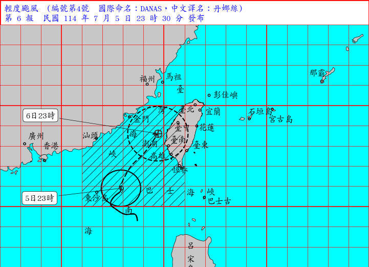 中央氣象署5日深夜11時30分發布,丹娜絲陸上警戒範圍擴大,對彰化以南及澎湖構成威脅。(氣象署提供)