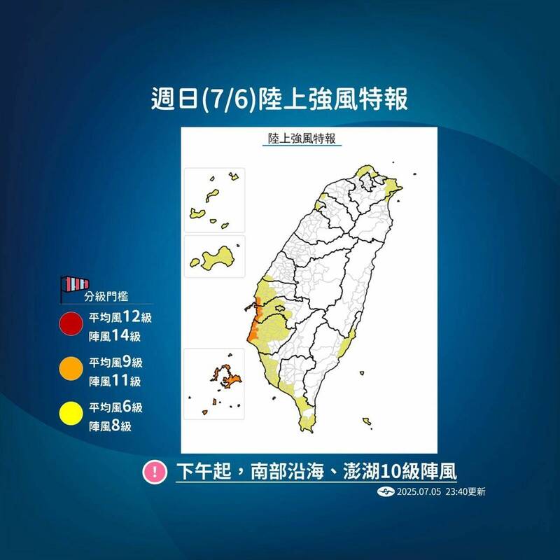 7/6陸上強風特報。(氣象署提供)