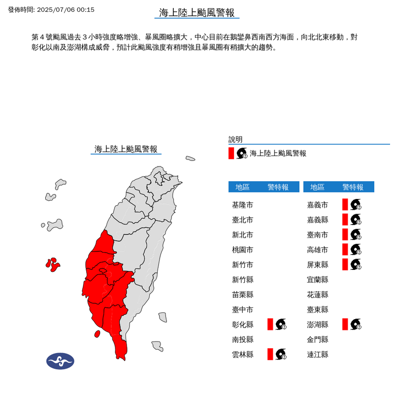 陸上警報範圍擴大!丹娜絲對彰化以南、澎湖構成威脅