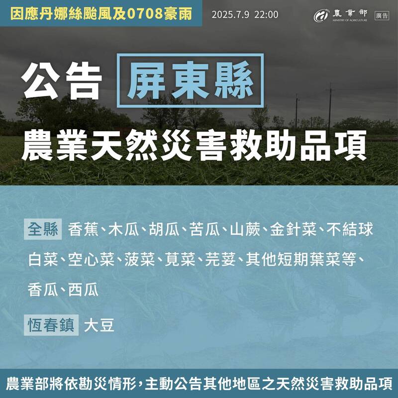 另新增高雄的香蕉、胡瓜、苦瓜,還有屏東全縣的香蕉、木瓜、胡瓜、苦瓜,以及屏東恆春鎮的大豆。
