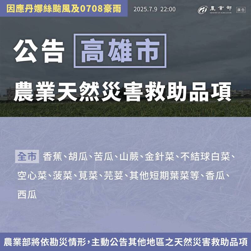 罕見自嘉義登陸的丹娜絲颱風造成台灣中南部農業嚴重災損,農業部經專家會議討論與現場勘災,公告第3波天災現金救助品項與範圍。