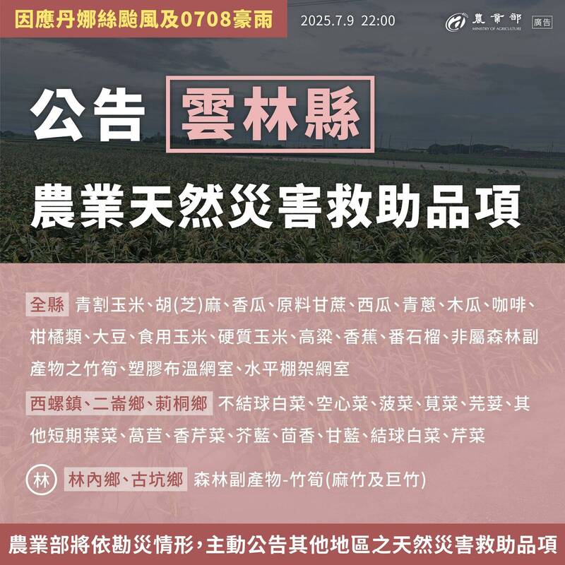 還有雲林縣全縣的青割玉米、胡麻、香瓜、原料甘蔗、西瓜、青蔥、木瓜、咖啡、柑橘類水果、大豆,以及雲林西螺鎮、二崙鄉、莿桐鄉的不結球白菜、空心菜、菠菜、莧菜、香菜、其他短期葉菜、萵苣、香芹菜、芥藍、茴香、甘藍、結球白菜、芹菜。