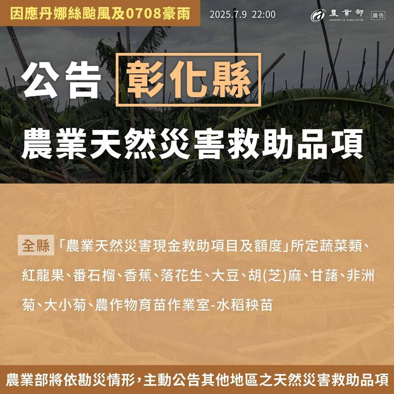丹娜絲颱風與後續外圍環流造成的708豪雨造成全台農損超過20億元,農業部今(9日)深夜公告最新天災現金救助與低利貸款品項範圍,新增彰化、雲林、高雄、屏東的品項,受災農民盡速備齊資料,到公所申請。
