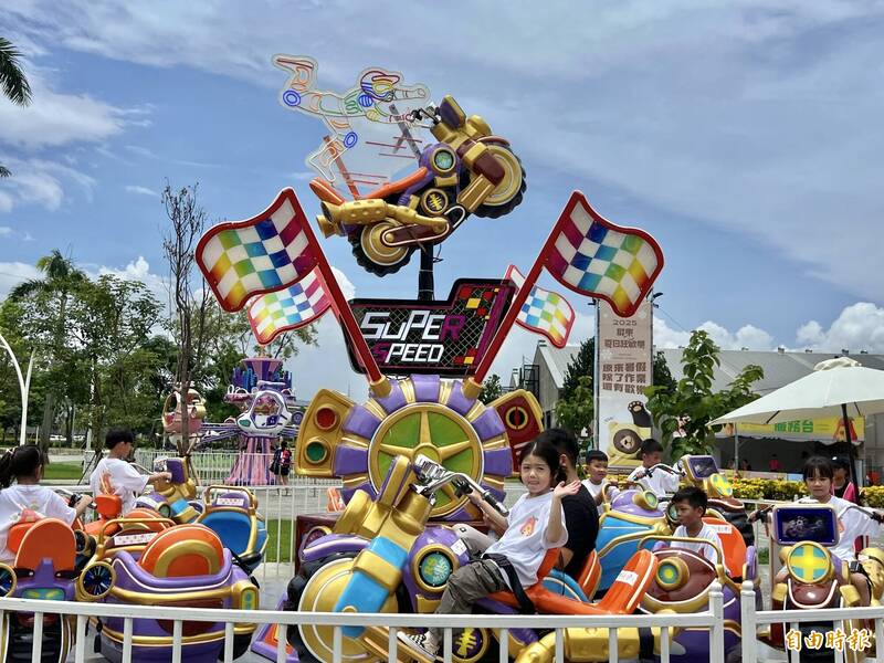 機械遊具是屏東夏日狂歡祭最受歡迎的一環,今年有動感刺激的瘋狂摩托車等全新體驗。(記者羅欣貞攝)