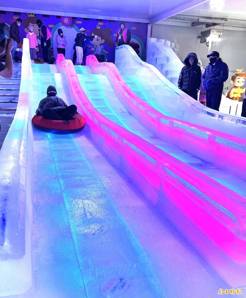 冰宮內有冰雕溜滑梯。(記者羅欣貞攝)