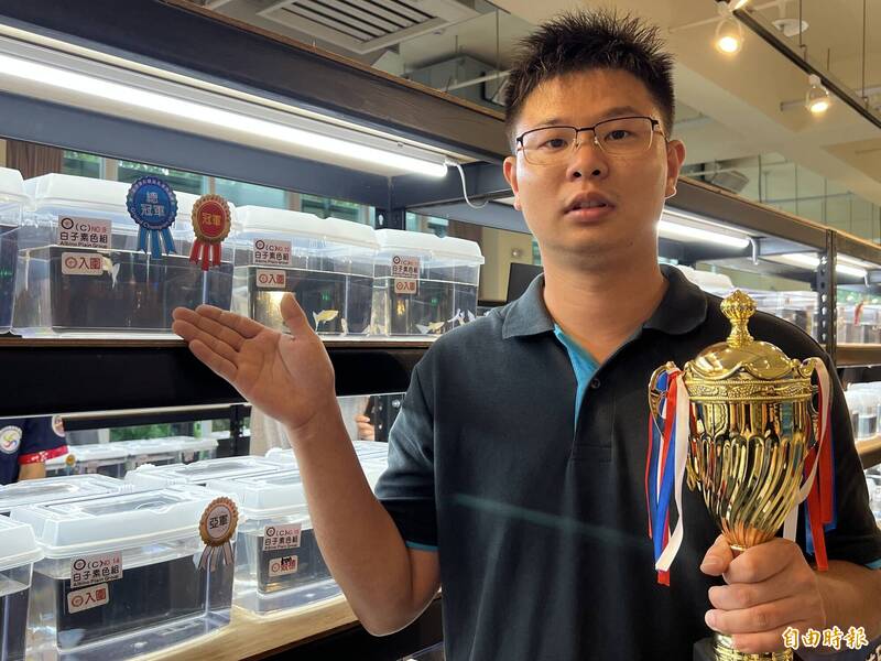 鄭軒宇飼養的孔雀魚體型勻稱、色澤飽滿、活動力極佳,是近年少見的頂級之作,獲得全場總冠軍。(記者羅欣貞攝)