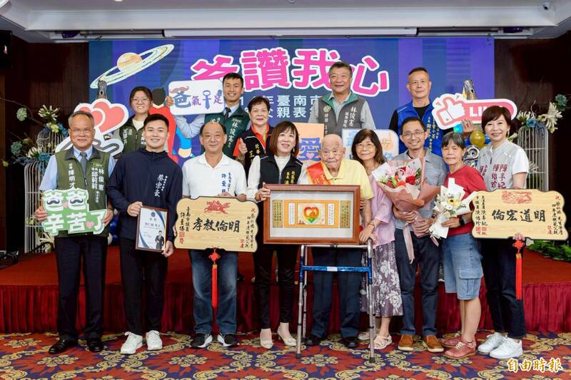台南市北區表揚今年度18位模範父親,最高齡為98歲蔡仁德。(記者王姝琇攝)