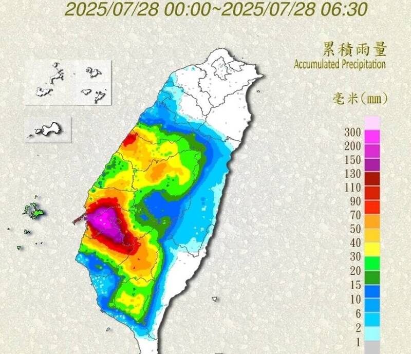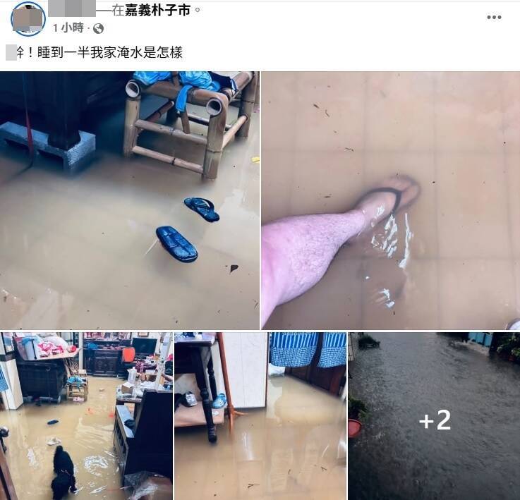 根據中央氣象署統計,到今天早上6點50分,太保市累積雨量310.5毫米,六腳鄉300毫米,朴子市281.5毫米,新港鄉280毫米,致災性的降雨造成多處鄉鎮市淹水,有民眾發現半夜家中客廳淹水,在網路社群上貼文「X!睡到一半我家淹水是怎樣」。