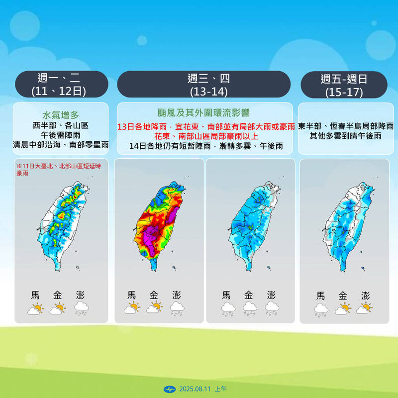 官欣平指出,週三颱風影響最為顯著,各地降雨,並伴隨強風現象,東半部、南部地區局部大雨或豪雨,花東地區、南部山區可能達局部豪雨以上等級雨勢;週四颱風漸漸遠離,但台灣水氣偏多,逐漸轉為多雲雷陣雨天氣,澎金馬則還有降雨;週五至週日轉為夏季天氣,多雲到晴及午後雷陣雨。