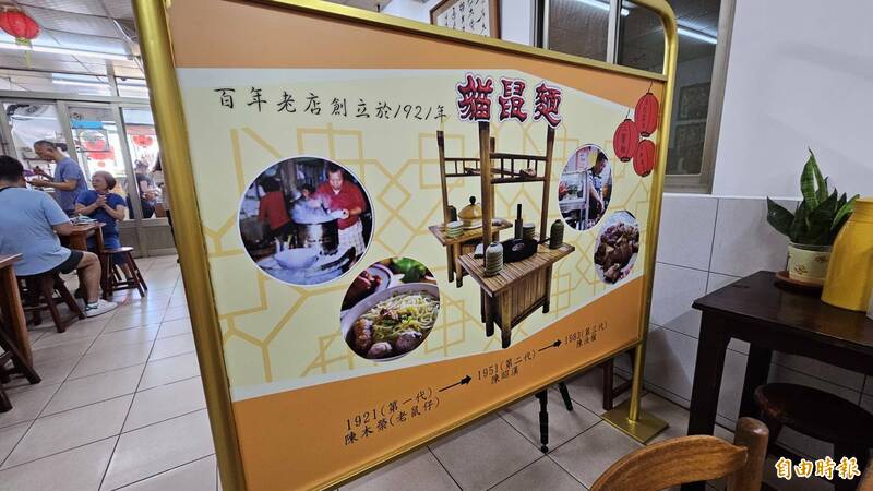 彰化百年老店貓鼠麵設立屏風,介紹店面簡史。(記者劉曉欣攝)