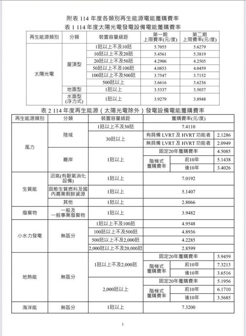 太陽能光電2025年的躉購費率表。(擷取自莊福泰臉書)