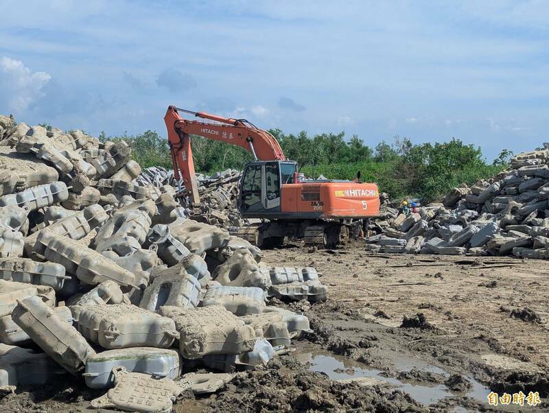 環境部說,74%光電板已安置及清除,僅剩約3.5萬片堆置在嘉義縣新庄滯洪池岸邊,分類整理中。(資料照)