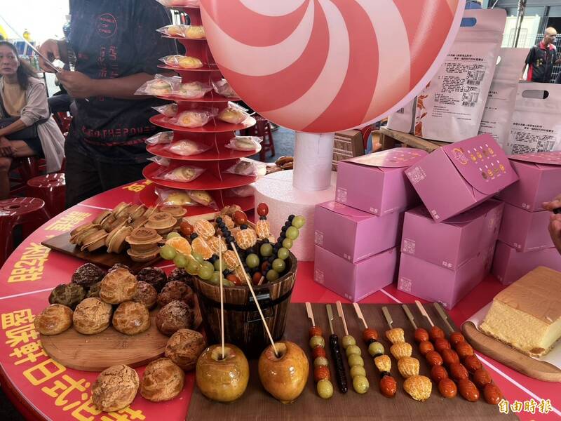 虎尾在地名菓水果糖葫蘆、古早味蛋糕等普桌。(記者黃淑莉攝)