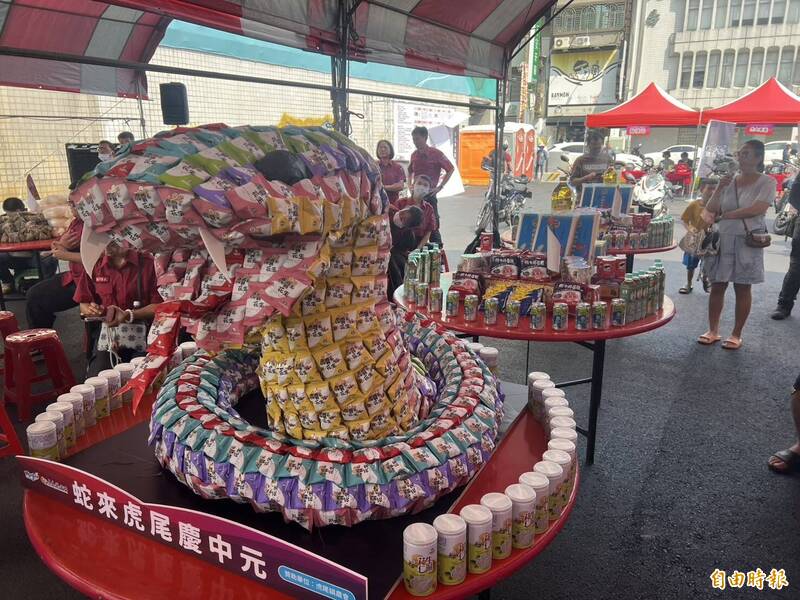 虎尾中元祭8大區聯合開香,虎尾農會以虎霸王花生包製作的蛇造型普桌,特別吸睛。(記者黃淑莉攝)