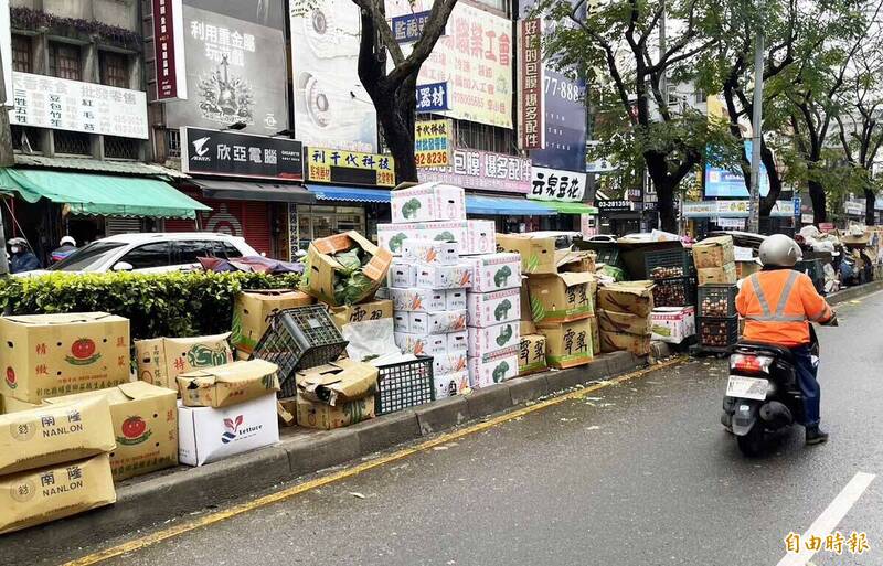 中壢區新明公有零售市場周邊環境改善前,市場前方分隔島堆滿非法攤販的貨架、紙箱等物品。(資料照,記者李容萍攝)