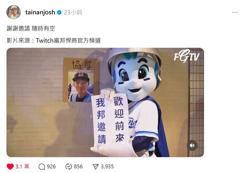 偷臭樂天?富邦悍將主場「協尋公告」 台南Josh秒回:隨時有空