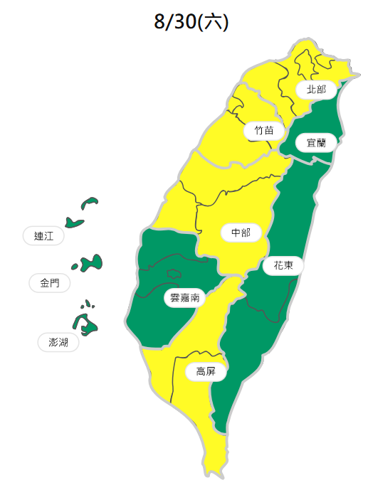 空氣品質方面,30日環境風場為偏東風,西半部位於背風側,雲嘉南、宜蘭、花東空品區及馬祖、金門、澎湖為「良好」等級;北部、竹苗、中部、高屏空品區為「普通」等級。