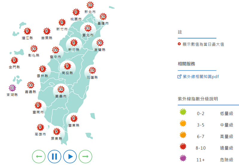 紫外線指數部分,澎湖縣危險級,其他縣市達過量級,外出請注意防曬。