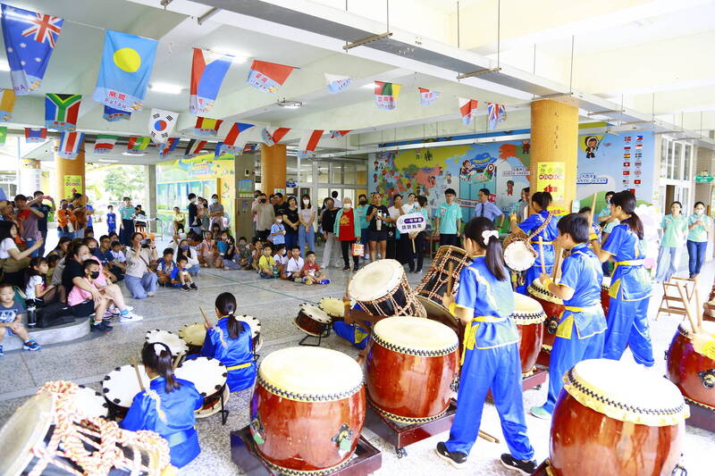 北園國小獲得鼓王盃冠軍的太鼓隊擊鼓迎接新生。(北園國小提供)