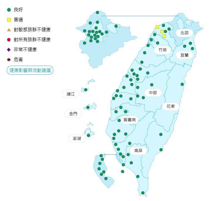 空氣品質部分,雲嘉南、宜蘭、花東空品區及馬祖、澎湖為「良好」等級;北部、竹苗、中部、高屏空品區及金門為「普通」等級。